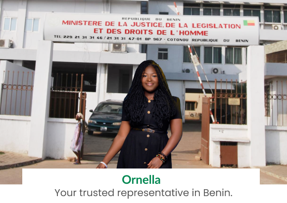 In-person delivery to Ministry of Justice, submission on myafroorigins.bj, confirmation of receipt, liaison support. Includes $100 government fee.